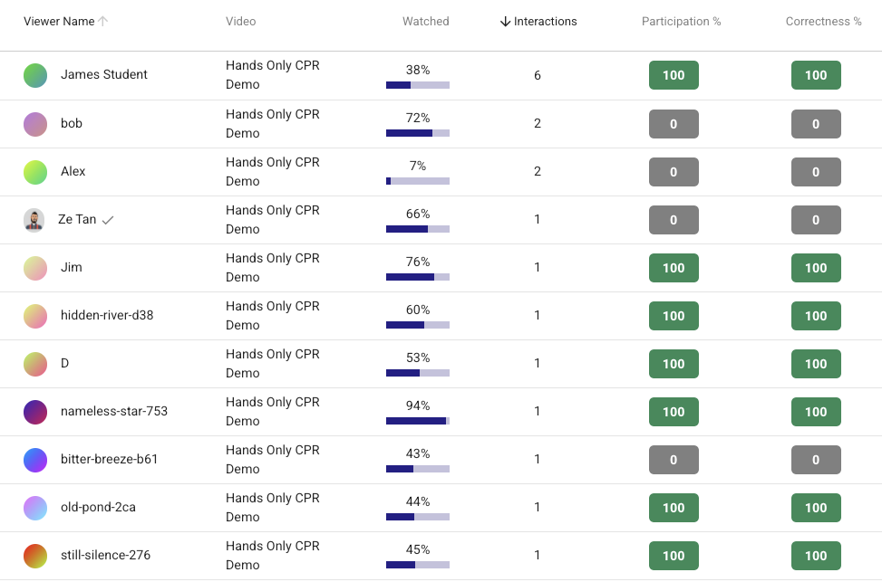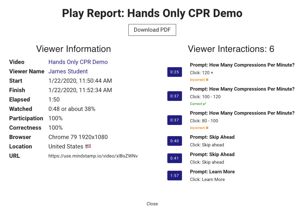 Every play on Mindstamp comes with a detailed Play Report showing exactly what somebody did: what parts they watched, the interactions they took, question responses, and much more. By examining the data you collect through your interactive training videos, both individually and in aggregate, you will understand how the content is performing and how people are responding to it, enabling you to adjust and improve to achieve you desired outcomes. Mindstamp allows for CSV export of all data collected so you can analyze it and use it where it’s most valuable to you.