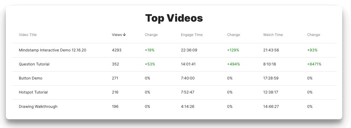 See your top videos and how they have performed against other interactive videos in your library, including views, engagement time and watch time.