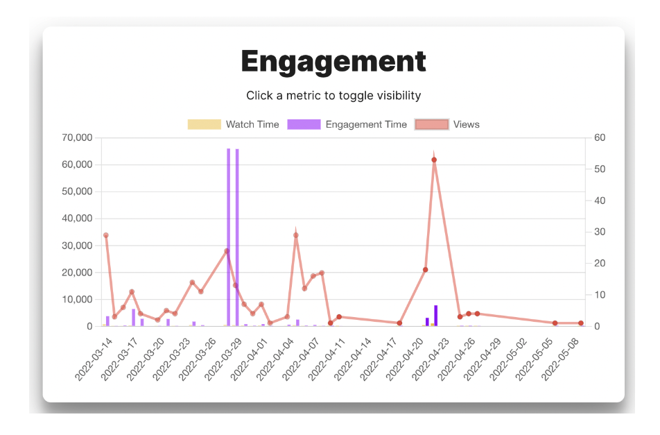 Toggle data around viewer watch time, engagement time, and total views to see how well your interactive video content is performing and how engaged your audience is. You can click on any of the data points to toggle the feature on and off and compare how data has changed over time. Watch time is total minutes that your video was playing whereas engagement time includes periods where you viewer is engaged with additional interactive content, such as answering a question, filling out a form, reading a linked webpage or checking out with a shopping cart.