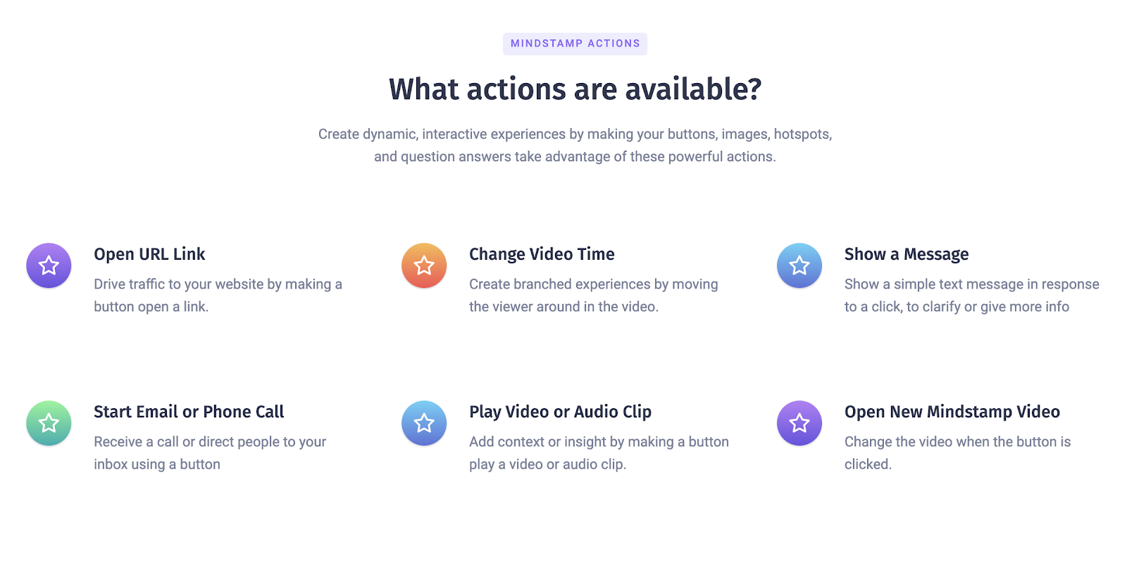Mindstamp makes it simple to take any video and make it an interactive and engaging viewer experience. Some of the most compelling interactions on Mindstamp are simple questions, ranging from free-form response to multiple choice and selection from a list. This is a very simple way to begin to engage viewers and keep them focused on your content.