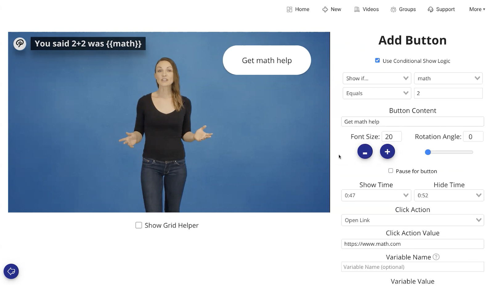 For example, using the Mindstamp question feature, you can ask each viewer what 2+2 equals. IF a viewer answers that 2+2 equals 2, THEN the “Get math help” button will be shown. When clicked, that interactive button will take them to a website that offers math help. On the other hand, IF a viewer answers that 2+2 equals 4, THEN a different message or CTA would display since the “Get math help” would not apply to them.