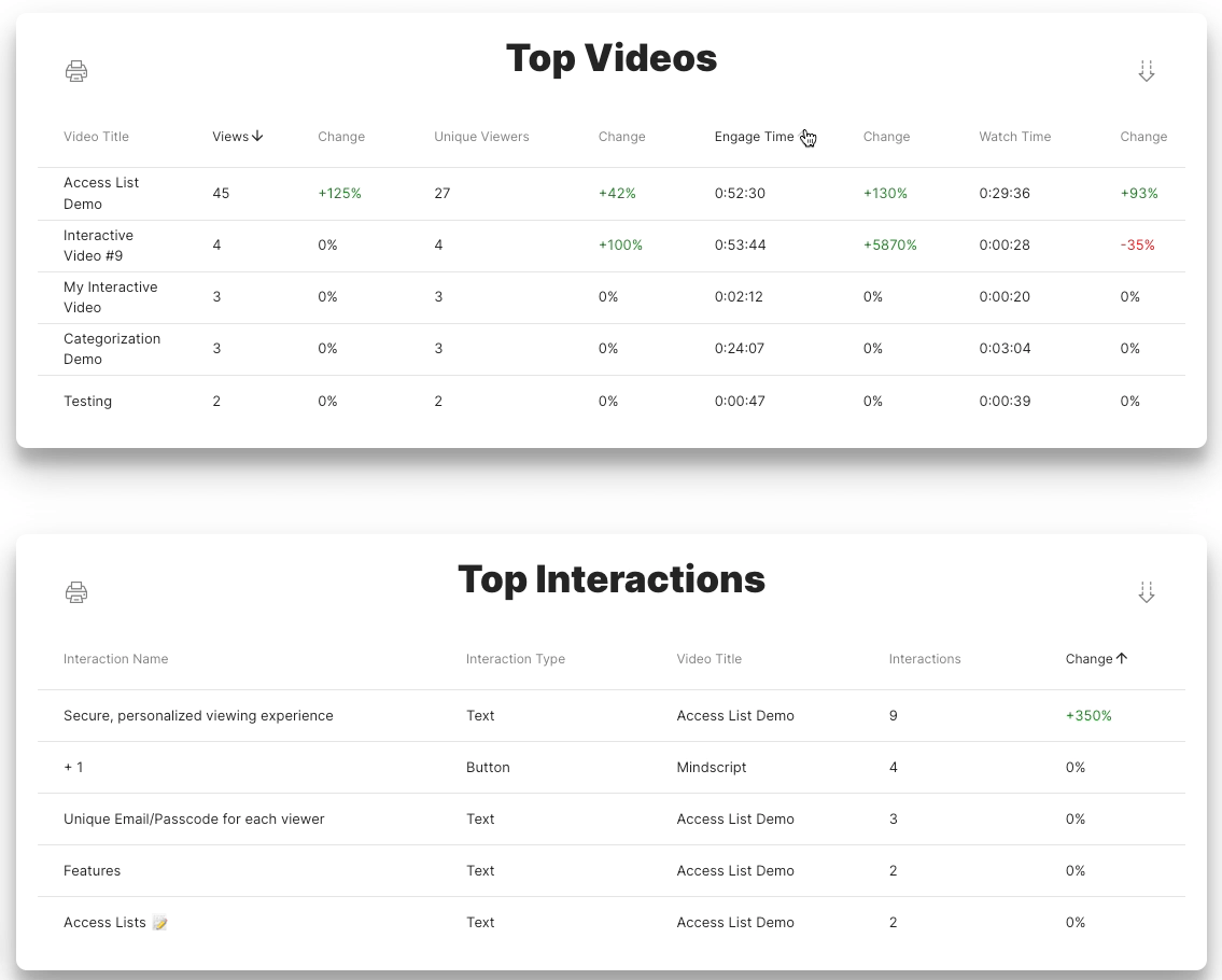 In addition to the Insights dashboard, we have also improved viewing and branching reports. If you click on a view, you will now see what portion of the video was watched and which interactions were engaged with (indicated by green) and what was missed (red). Additionally for branching views, you can see the entire experience from start to finish including what was and what wasn’t viewed and interacted with.