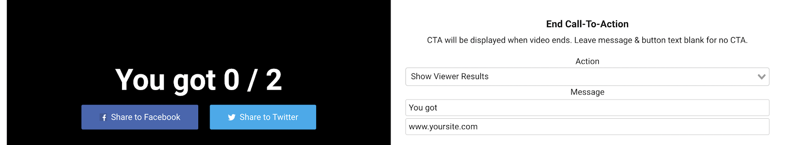 - Finally, if you want your viewers to share their results when they are done, you go into Settings and under ‘End Call-to-Action’ choose ‘Show Viewer Results’ which will give the viewer their correctness score (X of Y) with simple sharing links to Facebook and Twitter with a link back to whatever website you designate.