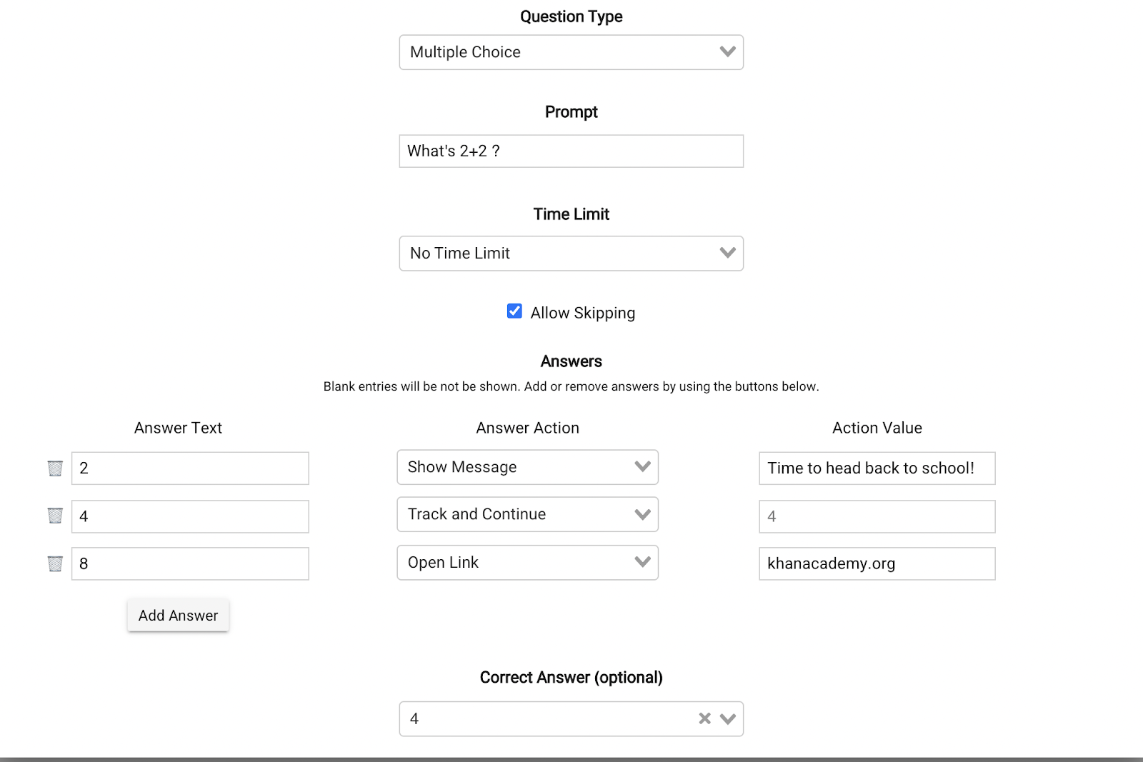 - If you create multiple questions at the same time they will form a question set which presents each question in series. Questions can be skippable and have a time limit. Tons of options to create your ideal quiz experience.
