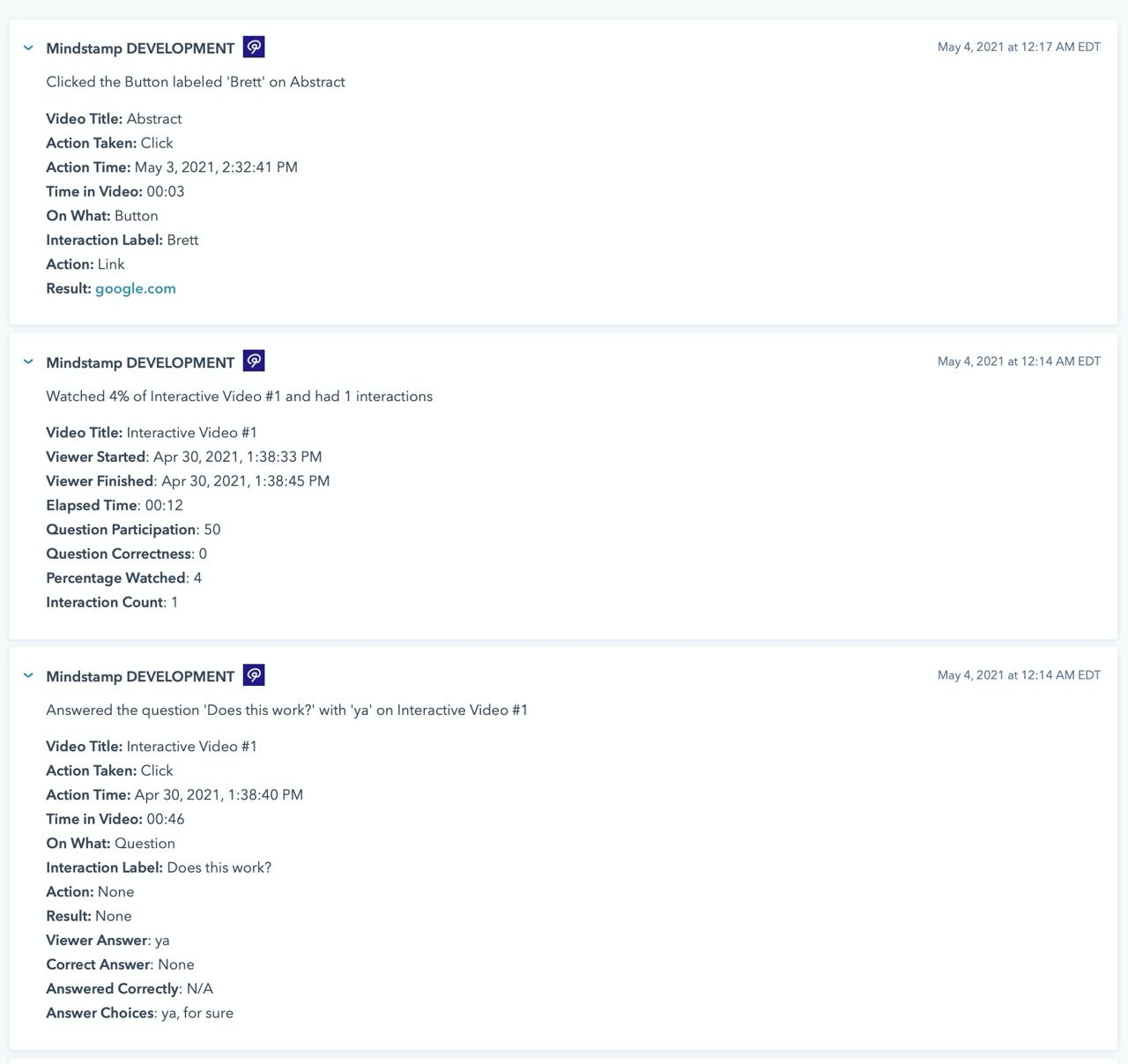 Mindstamp can also map specific interactive elements or events to custom HubSpot properties to update Contact or Company records with values captured or behavior completed by your interactive video viewers.