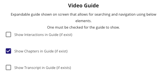 You can enable the new Video Guide by checking one or more of the visibility toggles for Chapters, Transcripts, and Interactions.
