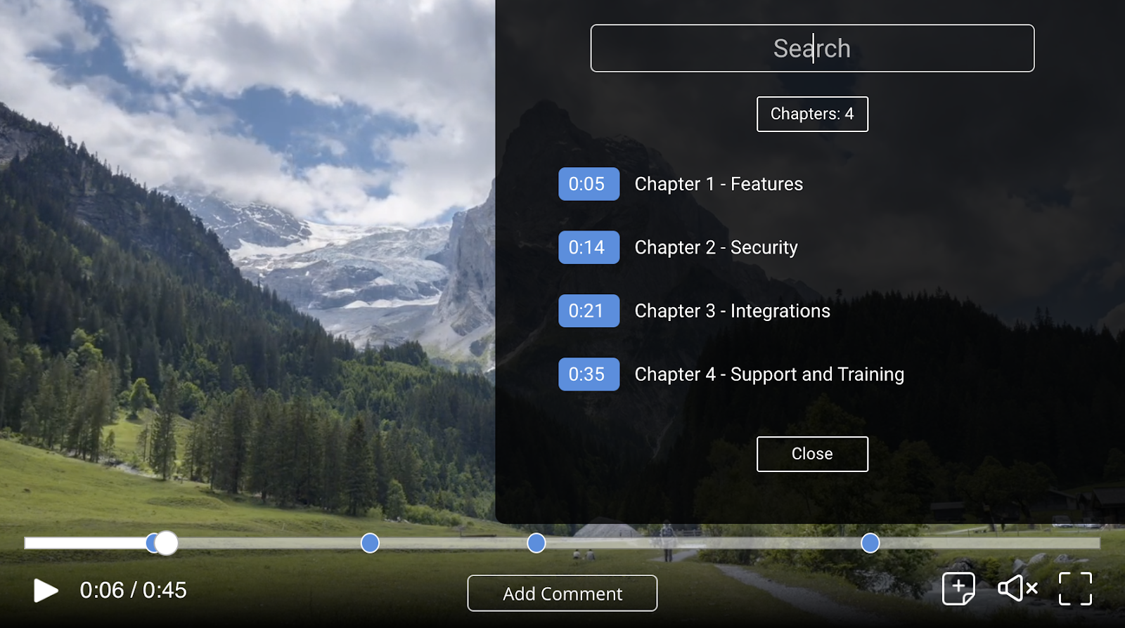 Perhaps the simplest tool in the quiver for creating user guided video experiences is to add chapters. Chapters create simple clickable markers along your timeline and can be exposed in a searchable and clickable viewer guide that slides out elegantly from the side of your video. This gives your viewers an immediate description of the contents of your video so they can jump to the items that interest them most.