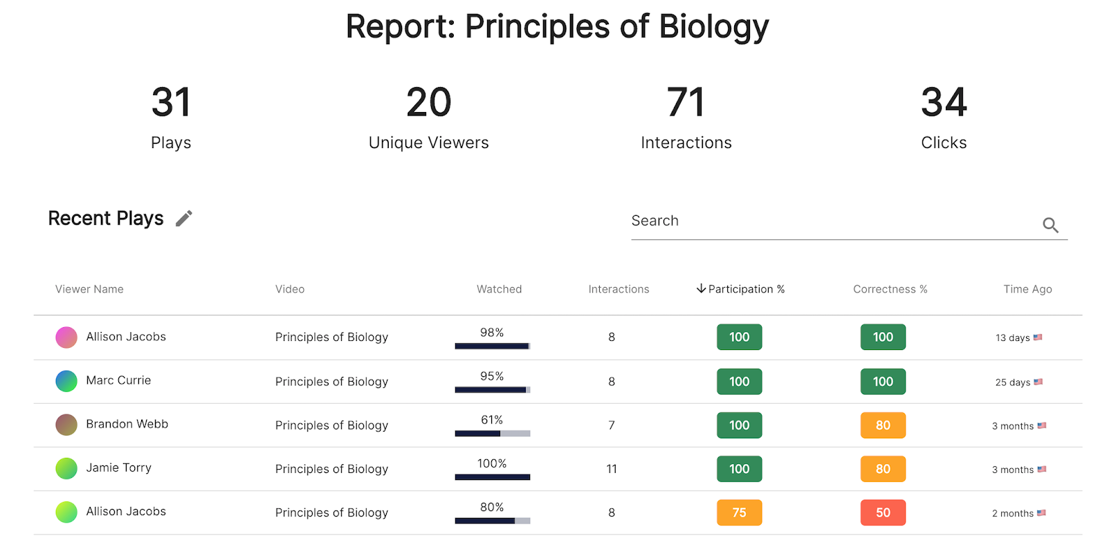 For educators or trainers, Groups make it easy to turn a video into an interactive lesson that includes a full report for every play, showing how content is interacted with by each person as well as Group as a whole. With a single glance, the video owner can gauge participation and understanding of content without relying on external resources such as post-video quizzing.