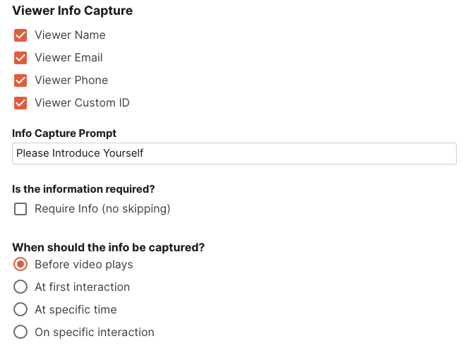 You can choose which information to capture, including name, email, and phone. You can choose whether it's required and when to capture it. For marketing purposes, we recommend first interaction so you don't experience drop-off. For training and other internal purposes, capturing it at the start of the video is recommended for the least disruption.