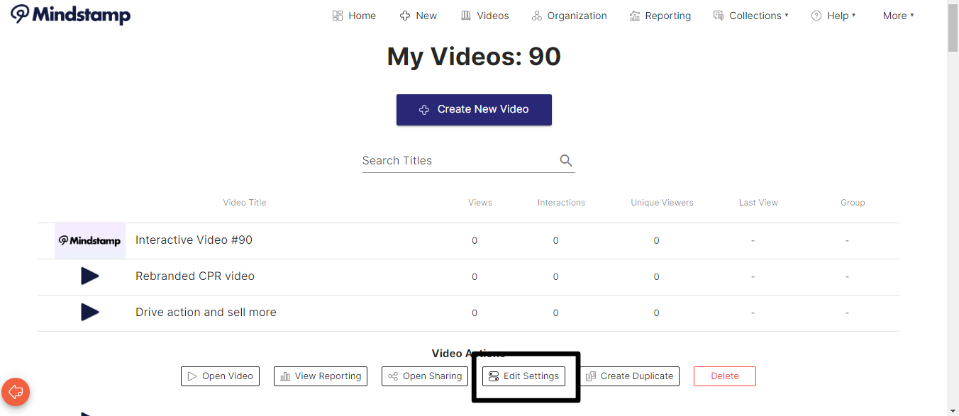 Click on the video you wish to edit and click “Edit Settings” to access your video’s settings.