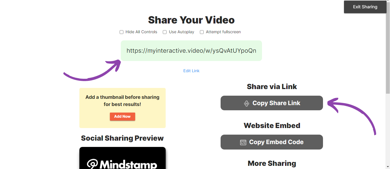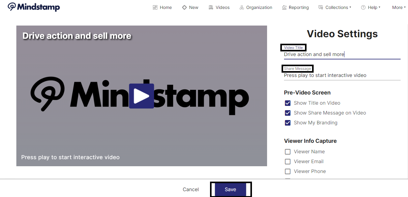 Before sharing your Mindstamp videos on social media, you can optimize the post to maximize views by changing the video’s title, changing the share message, and changing the video thumbnail directly from the Mindstamp interface.