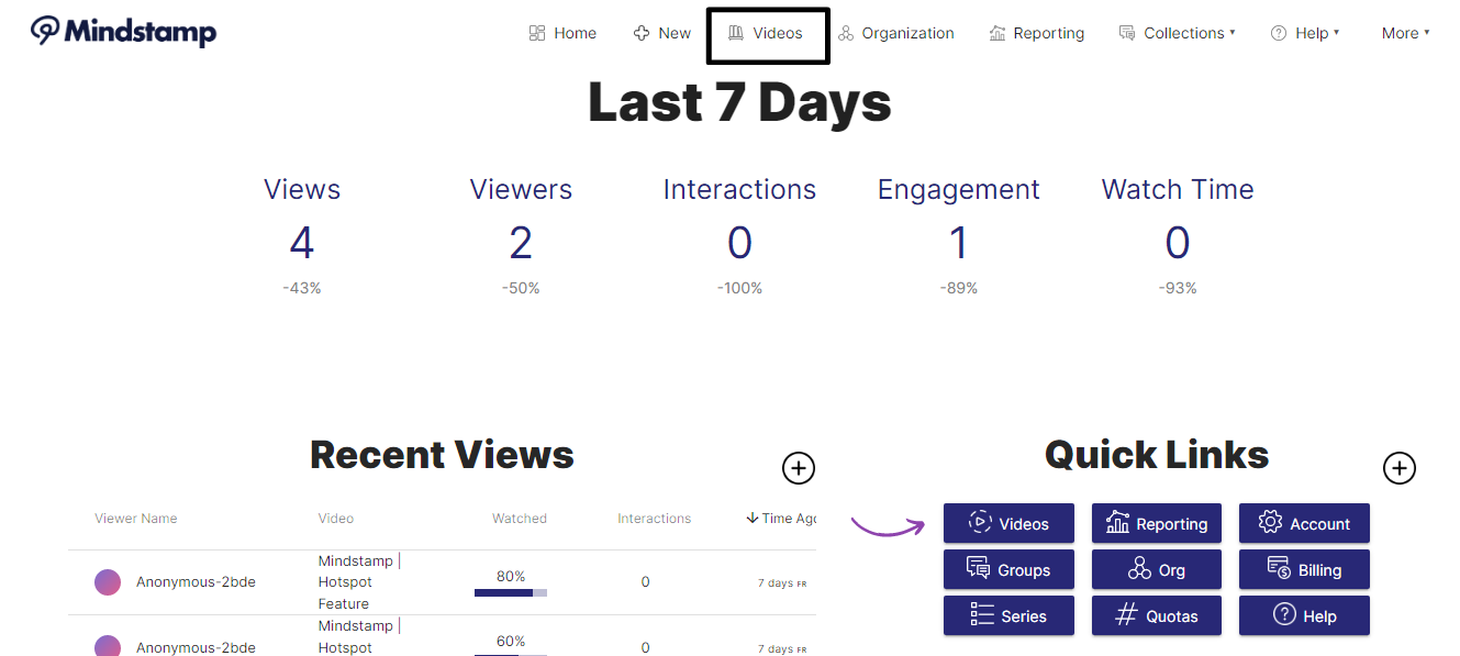 Next, find the “Videos” tab at the top, or use the “Quick Links” video tab to access your videos.
