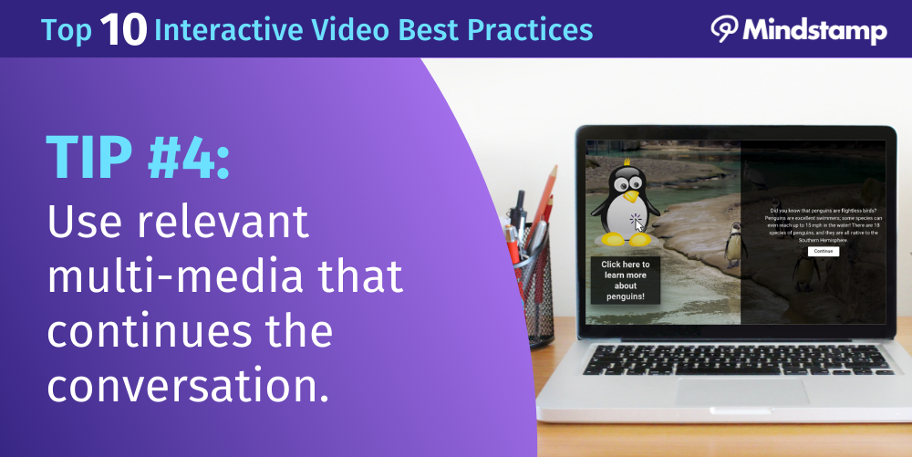 Using relevant multi-media that continues the conversation, such as images, is one of the Top 10 Best Practices for Interactive Video in 2021— To see the remaining best practices and learn more tips on creating successful interactive videos, visit “The Top 10 Best Practices for Interactive Video in 2021” or start your 14-day free trial with Mindstamp’s interactive video platform to see these video best practices in action.