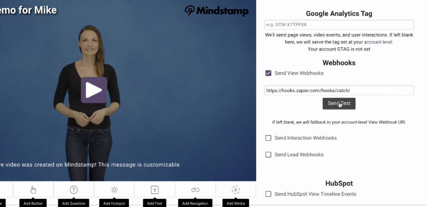 Mindstamp sends Webhooks to Zapier which allows you to connect interactive video data and analytics to a wide array of end-points.