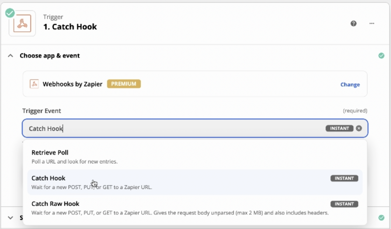 Once you’ve created your Webhook by Zapier Zap, you’ll need to select the Trigger Event to ‘Catch Hook’. This will provide a destination where Mindstamp can send the Webhook event, and Zapier will be configured to receive it.