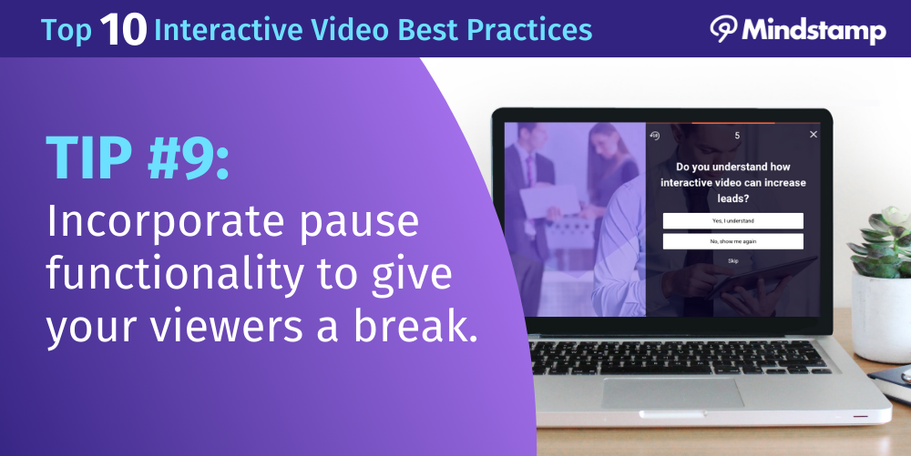 Incorporating areas to pause within your video can allow your viewers to pay attention to what is on the screen, allowing higher engagement and deeper understanding of your material, which is why it’s considered one of the Top 10 Best Practices for Interactive Video in 2021. To see the remaining best practices and learn more tips on creating successful interactive videos, visit “The Top 10 Best Practices for Interactive Video in 2021” or start your 14-day free trial with Mindstamp’s interactive video platform to see these video best practices in action.