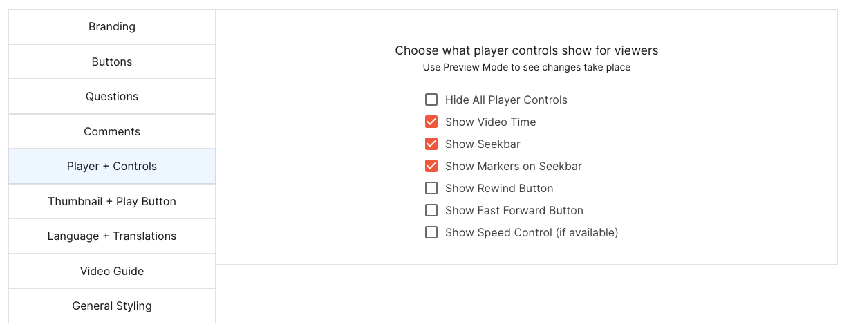 If you click on ‘Design’ while editing your Mindstamp Interactive Video, you’ll see a section titled ‘Player & Controls’. Within that section you can choose the following options: