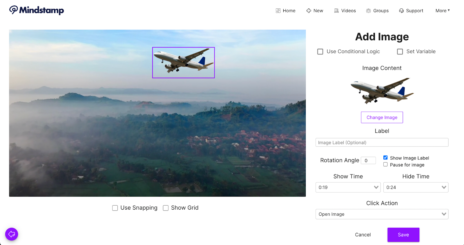 Once you add an interactive image to your video, you’ll be prompted with a number of helpful configuration options. First, you’ll be able to choose the placement and size of your image. You can even check the “Use Snapping” or “Show Grid” options to help with symmetry and evenness. To make sure your image is exactly where you want it, adjust the rotation angle for that perfect fit.