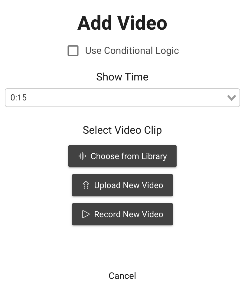 Determine at what time during the video you’d like your video clip to play and update the ‘Show Time’— In this case, we’ll add the video clip at 15 seconds in.