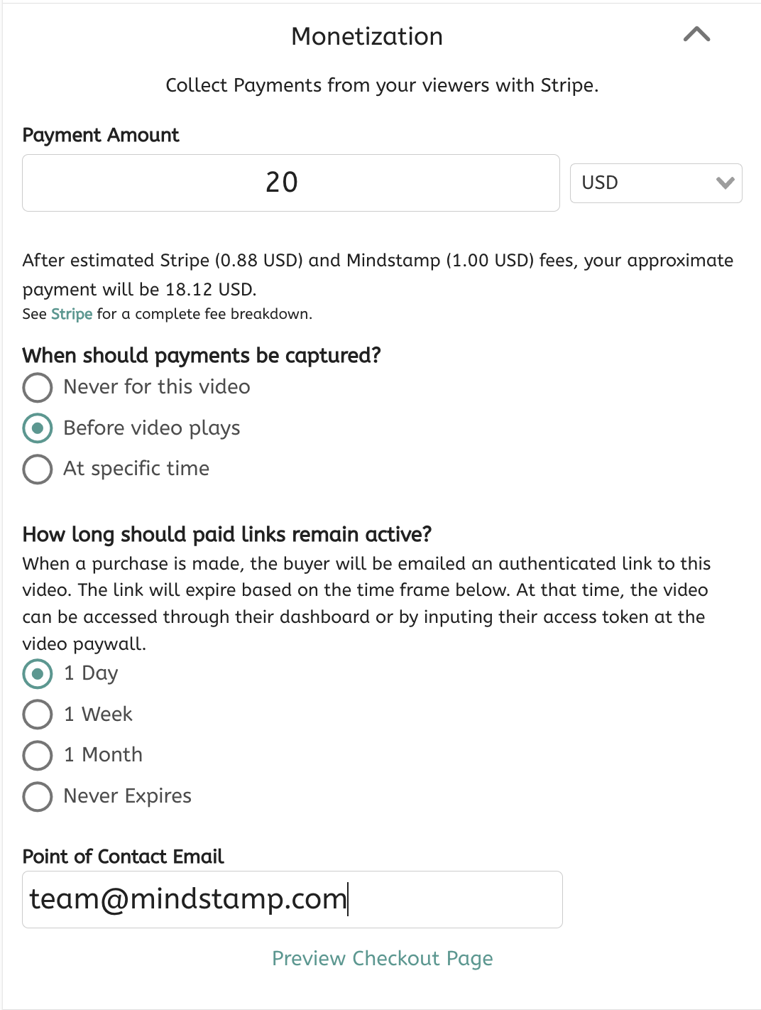 Here you can set your price, choose your currency, and choose when a viewer should have to pay to continue watching.